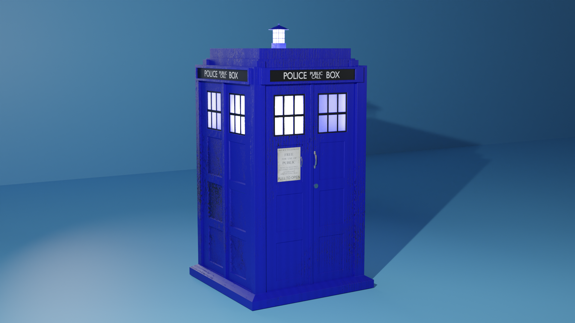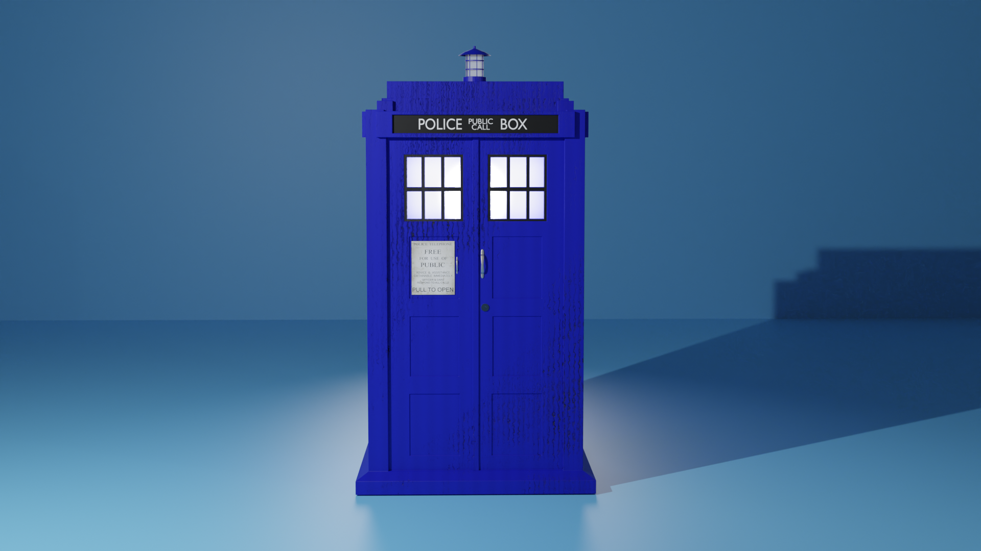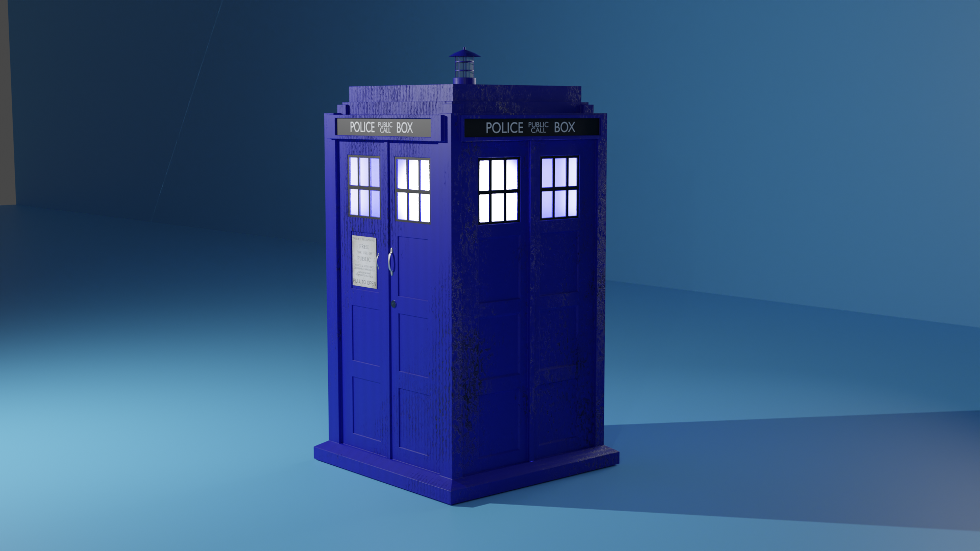 This is a model that I made of the TARDIS from Doctor Who. I modelled the TARDIS in Blender and I also textured it using procedural texturing. I also lit the scene, created some lights for the TARDIS itself.